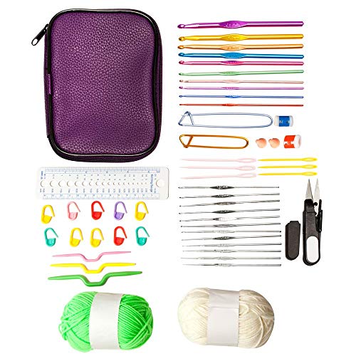 PureNoor Supplies 22pcs Aluminium Crochet Hooks Knitting Knit Needles Weave Yarn Set - 27 Crochet Accessories and 2 Yarn Balls - in Sturdy Travel Crochet Hooks Case