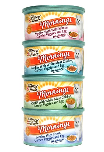 Fancy Feast Mornings Variety Box - 4 Flavors (Chicken Medley, Chicken Souffle, Trout Medley, & Salmon Medley) - 12 x 3 Ounce Cans (3 of Each Flavor) (12)