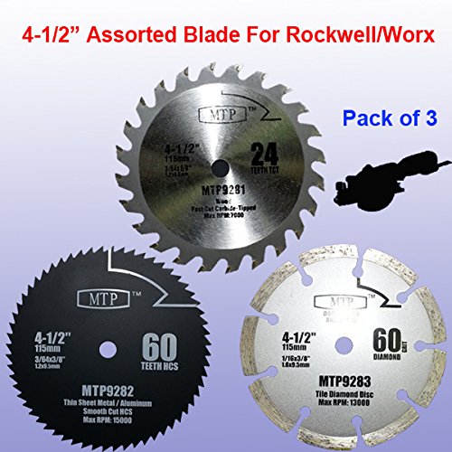 Pack of 3 Assorted Metal/wood/tile 4-1/2" 4.5 inch Circular Saw Blade for Rockwell Rk3441k, Worx WX429L RW9281