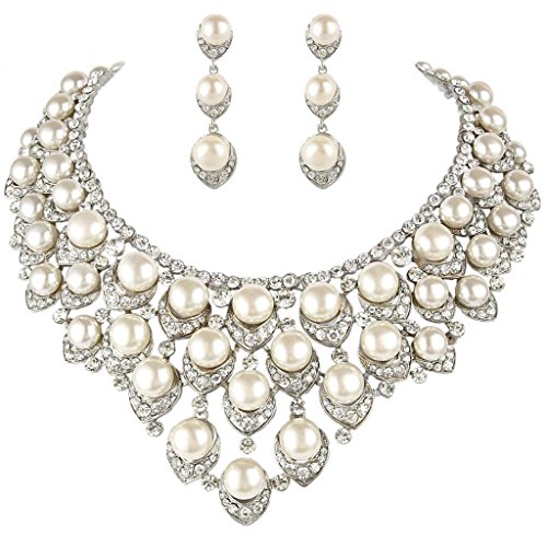 EVER FAITH Austrian Crystal Ivory Color Simulated Pearl V-Shaped Cluster Jewelry Set Clear