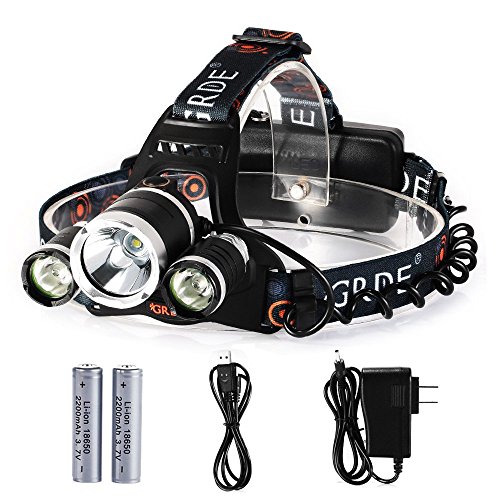 Headlamp LED Head light Waterproof 3 Beams Adjustable Headlight 4 Mode Hands Free Flashlight Torch for Camping Fishing Hiking Outdoor Sports 2 Rechargeable Batteries USB Cord Wall charger Included