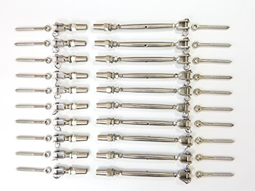 1/8 Cable Railing Kit Tensioner Quick Installation Stainless Steel 316 polished 10-Pack, Welded Fork Swageless 10-Pack, Eye Terminal With Wood Screw 20-Pack