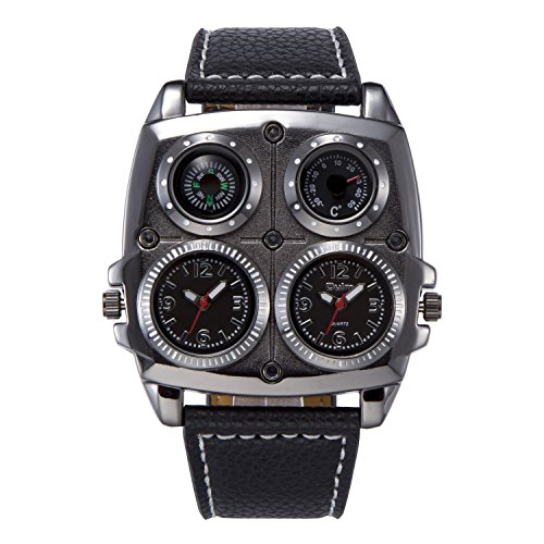 Aposon Mens Unique Large Face Analog Dual Time Bulky Quartz Business Casual Punk Watch with Compass and Thermometer (Decoration Purpose Only) - Black
