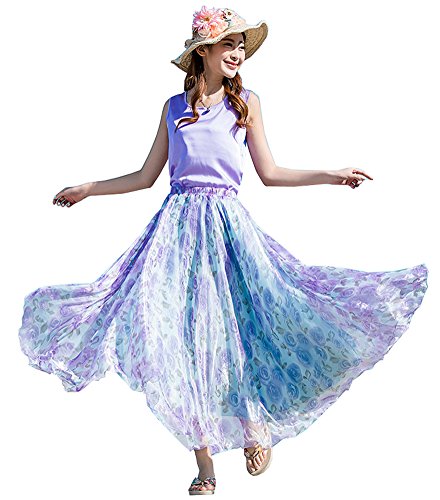 Izacu Flocc Full/ankle Length Elastic Pleated Retro Maxi Chiffon Bohemian Long Skirt