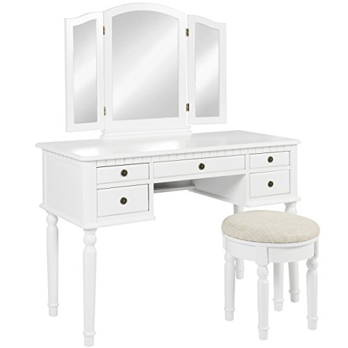 Best Choice Products Wooden Makeup Jewelry Vanity Set Table With Mirror and Seat Bench White