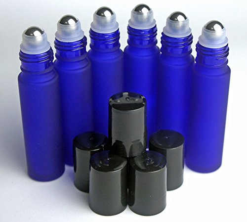 10ML Cobalt Frosted Blue Glass Bottle with Metal Ball Roll-on Applicator and Black Cap - Set of 6