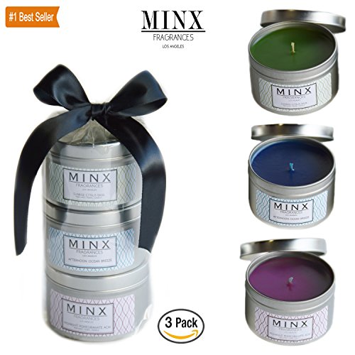 CYBER MONDAY WEEK DEAL! Set of 3 Scented Soy Candles in Cute Travel Tins by MINX Fragrances | Candle 3-Pack: Citrus & Basil, Ocean & Pomegranate Acai | Aromatherapy Gift set | Great Gift Idea!