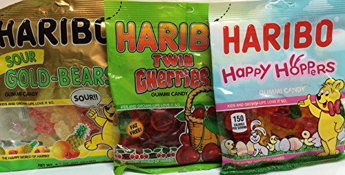 Fat-free Twin Cherry Haribo Gummi Candy; NEW, Limited Haribo Gummi Candy Spring Happy Hoppers; Haribo Gummy Bear Sour Gold-Bears. Unique Gift Idea! 3-pc