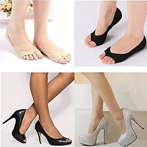 Toeless, No Show, Low Cut, Peep Toe, Hidden Silicone Pad Liner Cotton Socks by JERN (Black and Beige)