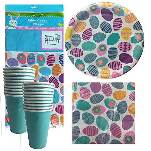 Easter Disposable Dinnerware Party Bundle - Big Colored Eggs - Dinner Plates, Cups, Napkins and Table Cover (Serves 18)