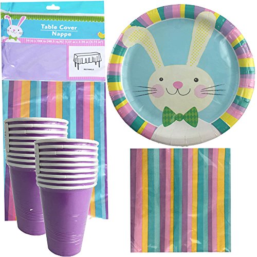 Easter Disposable Dinnerware Party Bundle - Bunny Stripe - Dinner Plates, Cups, Napkins and Table Cover (Serves 18)