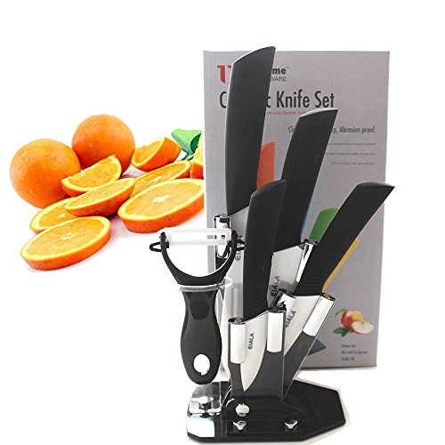 EIALA 6PCS White Blade Ceramic Knife Set Chef Kitchen Knives 3" Paring Knife, 4" Fruit Knife, 5" Utility Knife, 6" Chef Knife + Peeler + Holder (Black)