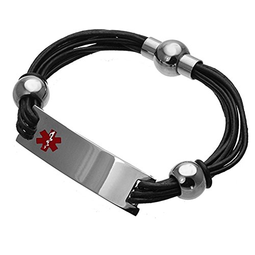 Medical Alert 316L Stainless Steel and Leather Unisex Bracelet, Engravable 8.5"