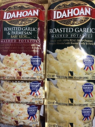 Idahoan Mashed Potatoes Roasted Garlic Variety Bundle, 4 oz (Pack of 6) includes 3-Packages of Roasted Garlic Mashed Potatoes Plus 3-Packages Roasted Garlic & Parmesan Baby Reds Mashed Potatoes