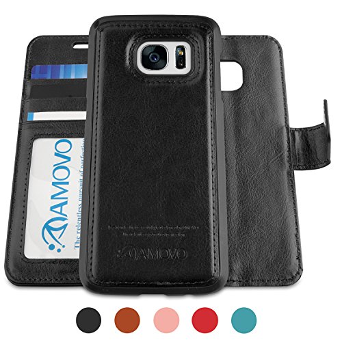 Amovo Case for Galaxy S7 Edge [2 in1] [Detachable Wallet Folio] [2 in 1] [Premium Vegan Leather] S7 Edge Wallet Case with Leather Strap Gift Box Package (Black)