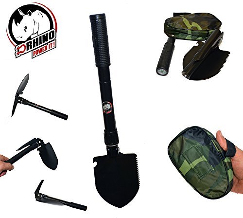D-Rhino Outdoors Folding Shovel 16.5" with Pickax and Bottle Opener - Backpacking, Hiking and Camping Multi-functioning - Garden - Snow - Military Style Survival with Case