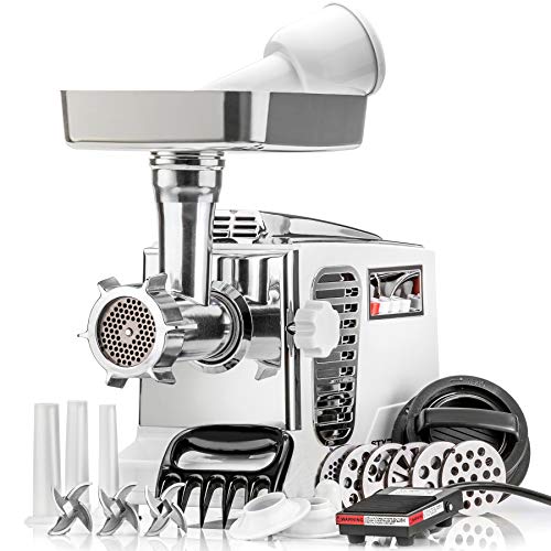STX Turboforce II"Platinum" w/Foot Pedal Heavy Duty Electric Meat Grinder & Sausage Stuffer: 6 Grinding Plates, 3 S/S Blades, 3 Sausage Tubes, Kubbe, 2 Meat Claws, Burger-Slider Patty Maker - White