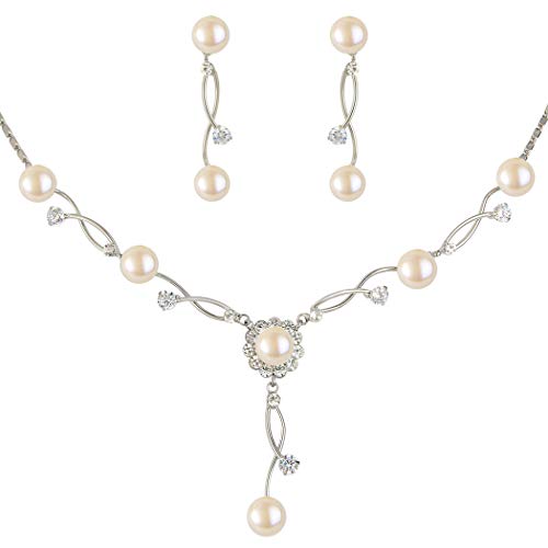 EleQueen Women's Cubic Zirconia Simulated Pearl Bridal Necklace Earrings Jewelry Set Ivory Color