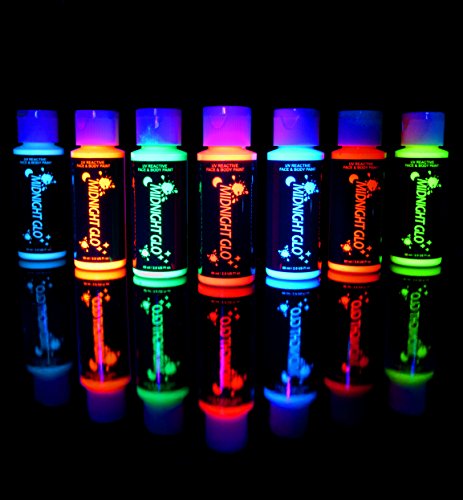 UV Neon Face & Body Paint Glow Kit (7 Bottles 2 oz. Each) Top Rated Blacklight Reactive Fluorescent Paint - Safe, Washes Off Skin, Non-Toxic, Midnight Glo