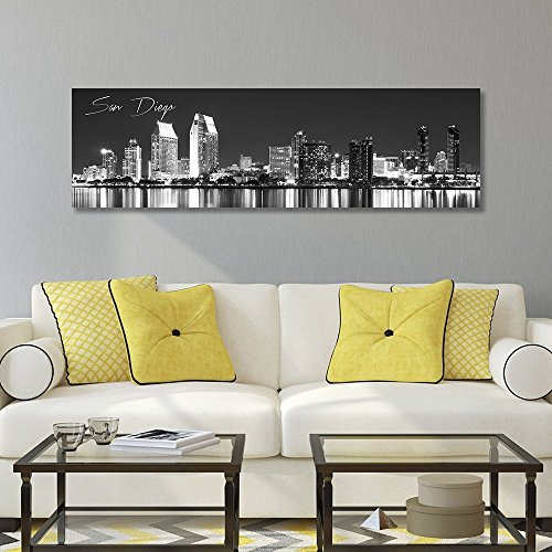 WallsThatSpeak 8" x 24" Panoramic San Diego Cityscape Picture, Black and White Stretched Canvas Art Prints, Wall Decoration for Bedroom or Office, Framed and Ready to Hang