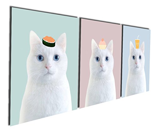 Gardenia Art - Cute White Cats with Delicious Foods Modern Canvas Wall Art Paintings Animals Artwork for Bedroom Living Room Decoration,12x16 inch per Piece, Stretched and Framed, Ready to Hnag