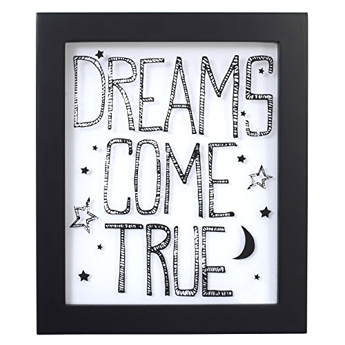 - Framed wall art features "Dreams Come True" saying in black & white with moon & stars on a crisp white Plexiglas background with black wood frame.