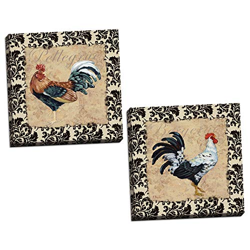 wallsthatspeak Decorative Bordered French Rooster Bergerac and Pellegrue Set; Country Decor; Two 12x12in Hand-Stretched Canvases