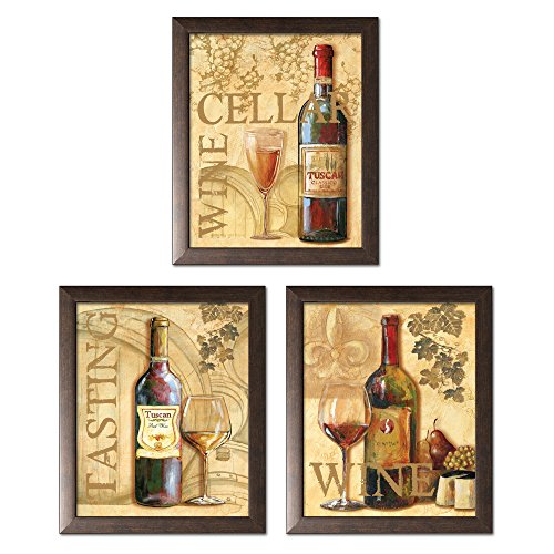 Poster Discount Tuscan Red, White and Rose Bottles and Glasses of Wine; Kitchen Décor; Three 8x10in Brown Framed Prints