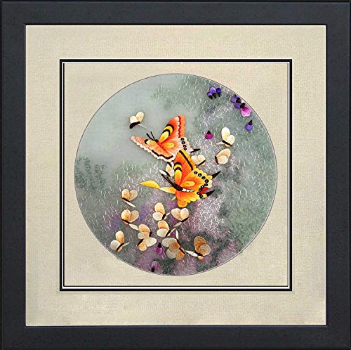 King Silk Art 100% Handmade Embroidery Framed Two Buetterflies Playing with Their Children Oriental Wall Hanging Art Asian Decoration Tapestry Artwork Picture Gifts 32206WF