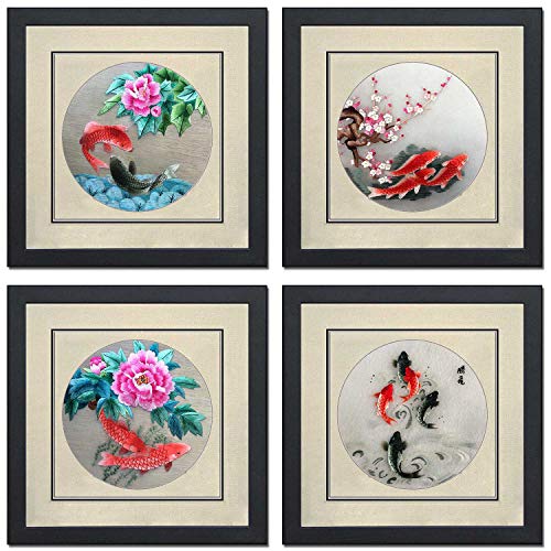 100% Handmade Embroidery Framed Mixed Group Koi Oriental Wall Hanging Art Asian Decoration Tapestry Artwork Picture Gifts (32201WF 32202WF 32203WF 32204WF)