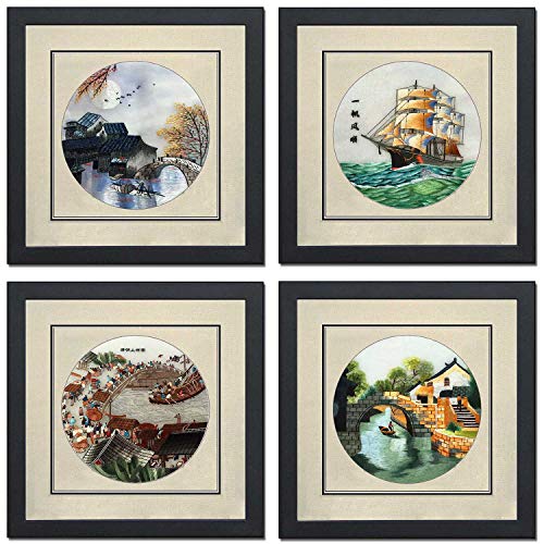 100% Handmade Embroidery Framed Mixed Group Boat Oriental Wall Hanging Art Asian Decoration Tapestry Artwork Picture Gifts (32217WF 32218WF 32219WF 32220WF)