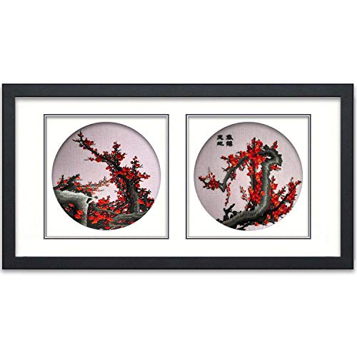 King Silk Art 100% Handmade Embroidery New Designed Red Plum Blossom Flower Wall Hanging 13" x 24" Double Picture Core Chinese Print Framed Painting Gift Oriental Asian