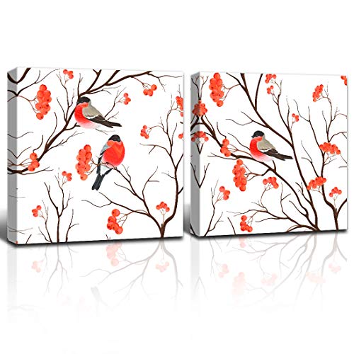 Gardenia Art red Kitchen Accessories Bullfinches Sitting on Branch of Rowan Canvas Prints Wall Decorations for Home for Bedroom 16x16 in 2 Panels Stretched and Framed
