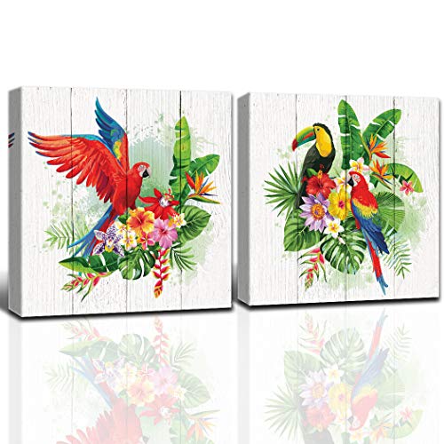 Gardenia Art Parrot, Toucan, Palm Leaves and Exotic Flowers Canvas Print Wall Art Kitchen Decorations Theme Sets House Decor for Living Room 16''16'' 2 pcs/Set Framed