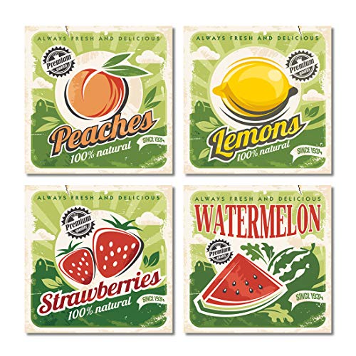 Gardenia Art Peaches Lemon Strawberry Watermelon Vintage Poster Anime Painting Kitchen Accessories Wall Art Home Decorations for Dining Room Living Room Framed 12x12 in 4 PCS