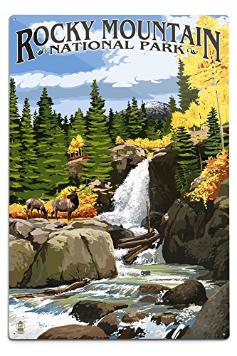 Lantern Press Rocky Mountain National Park, Colorado - Elk and Waterfall 53498 (6x9 Aluminum Wall Sign, Wall Decor Ready to Hang)