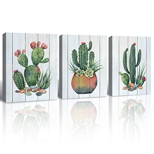 Gardenia Art Watercolor Cacti and Succulents on Wooden Texture Canvas Print Pot Flower Plants Painting Living Room Bathroom Wall Art 12x16 inch/Piece, Framed, 3 Panels