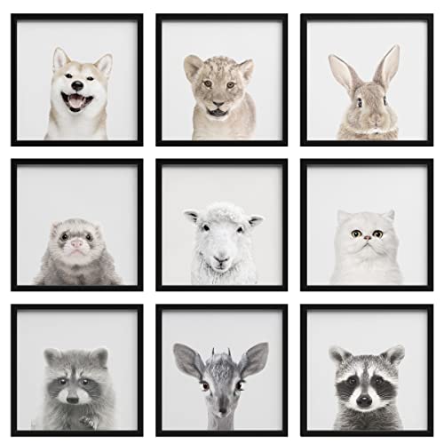 Ashbrook Framed Wall Art Collage Print Gallery Set Duotone Animal Variety Portraits Kids Group Photography Realism CloseUp Cool Black and White for Living Room, Bedroom, Office