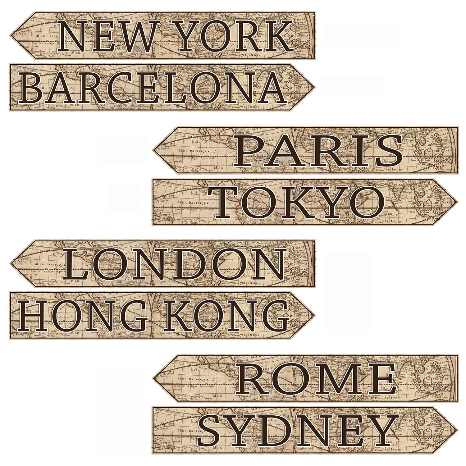Beistle Around The World Paper Street Wall Signs 8 Piece Traveler Decorations, City Names Cutouts, 3.75" x 23.75", Tan/Brown/Black