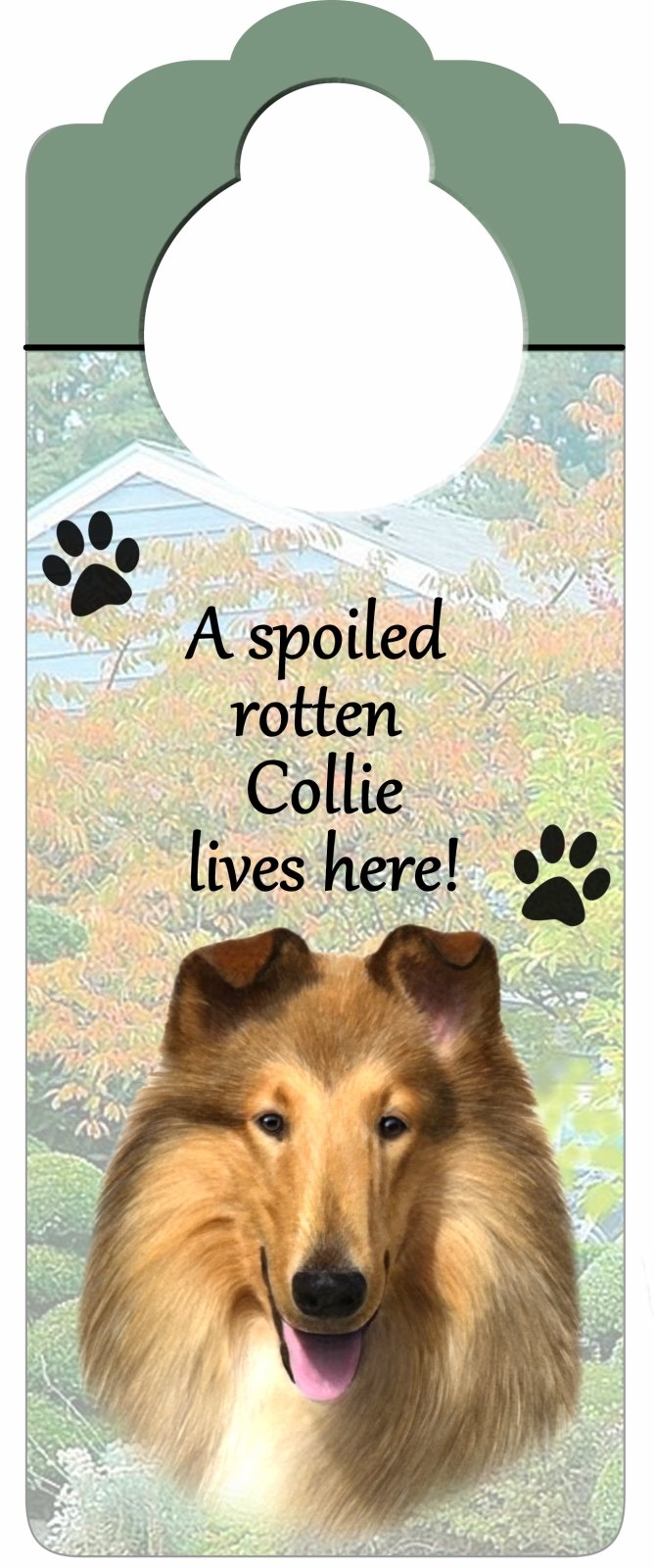 Collie Wood Sign "A Spoiled Rotten Collie Lives Here"with Artistic Photograph Measuring 10 by 4 Inches Can Be Hung On Doorknobs Or Anywhere In Home