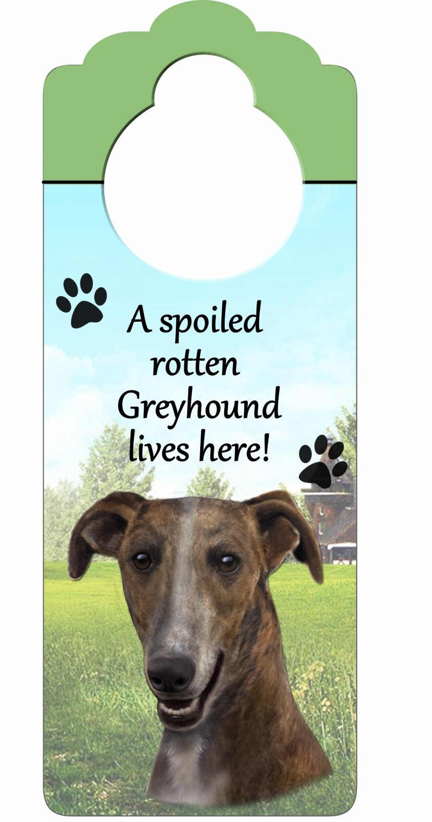 Greyhound, Brindle Wood Sign "A Spoiled Rotten Greyhound, Brindle Lives Here"with Artistic Photograph Measuring 10 by 4 Inches Can Be Hung On Doorknobs Or Anywhere In Home
