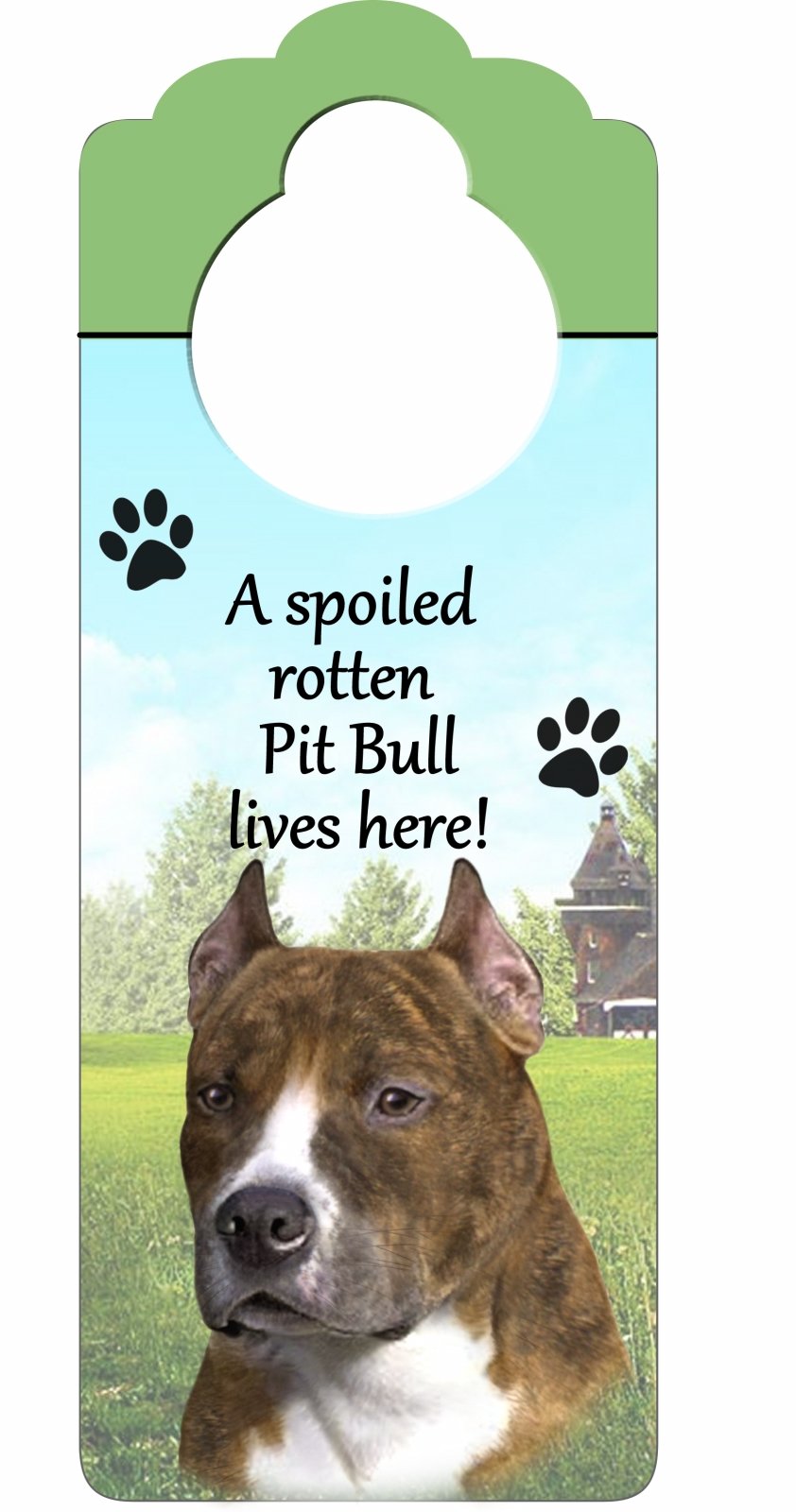 Pit Bull, Brindle Wood Sign "A Spoiled Rotten Pit Bull, Brindle Lives Here"with Artistic Photograph Measuring 10 by 4 Inches Can Be Hung On Doorknobs Or Anywhere In Home