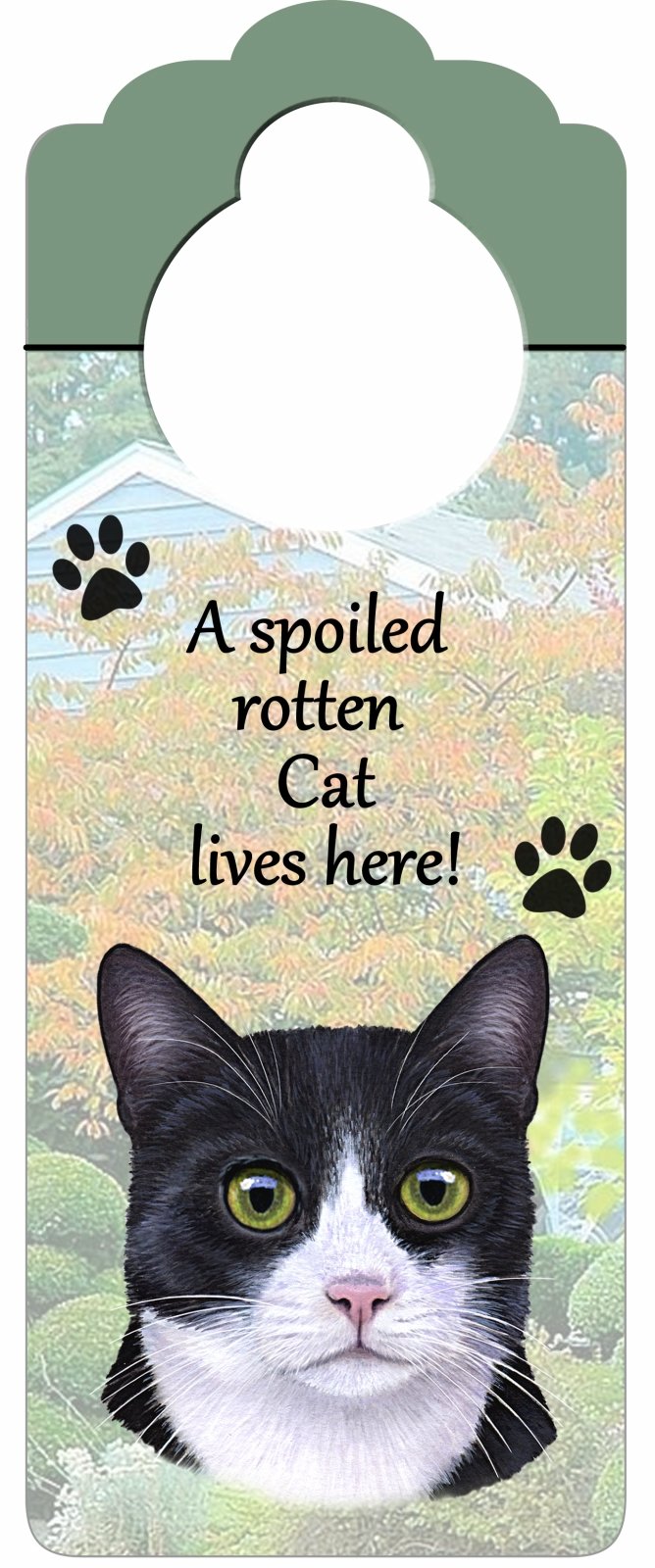 Black and White Cat Wood Sign "A Spoiled Rotten Black and White Cat Lives Here"with Artistic Photograph Measuring 10 by 4 Inches Can Be Hung On Doorknobs Or Anywhere In Home