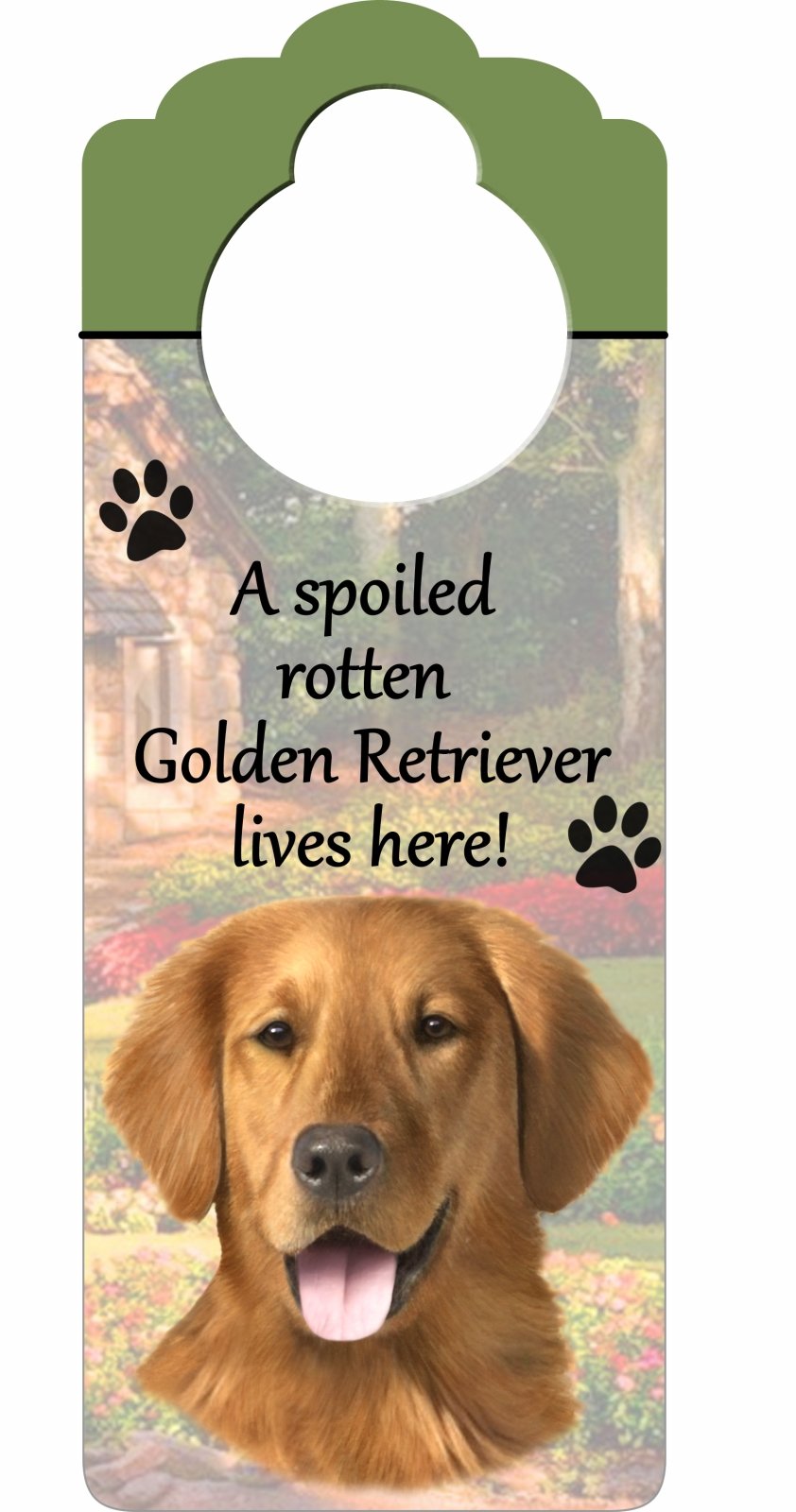Golden Retriever Wood Sign "A Spoiled Rotten Golden Retriever Lives Here"with Artistic Photograph Measuring 10 by 4 Inches Can Be Hung On Doorknobs Or Anywhere In Home