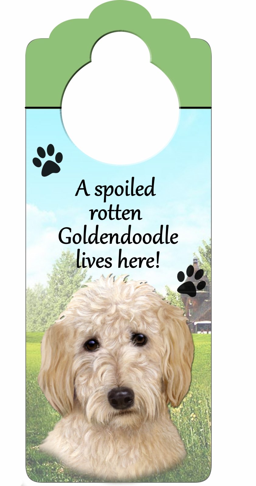 Goldendoodle Wood Sign "A Spoiled Rotten Goldendoodle Lives Here"with Artistic Photograph Measuring 10 by 4 Inches Can Be Hung On Doorknobs Or Anywhere In Home