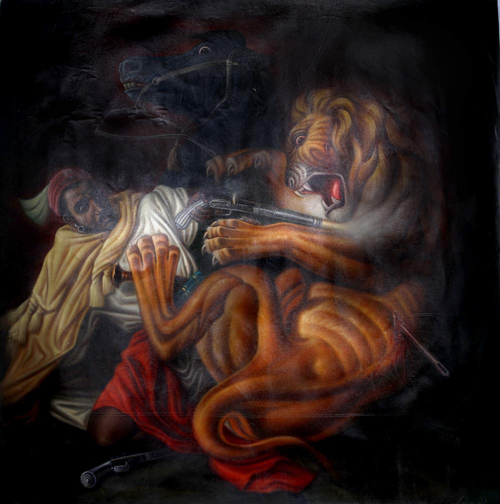 Exotic India The Hunt of a Lion - Oil Painting on Canvas - Artist: Madan Gomay