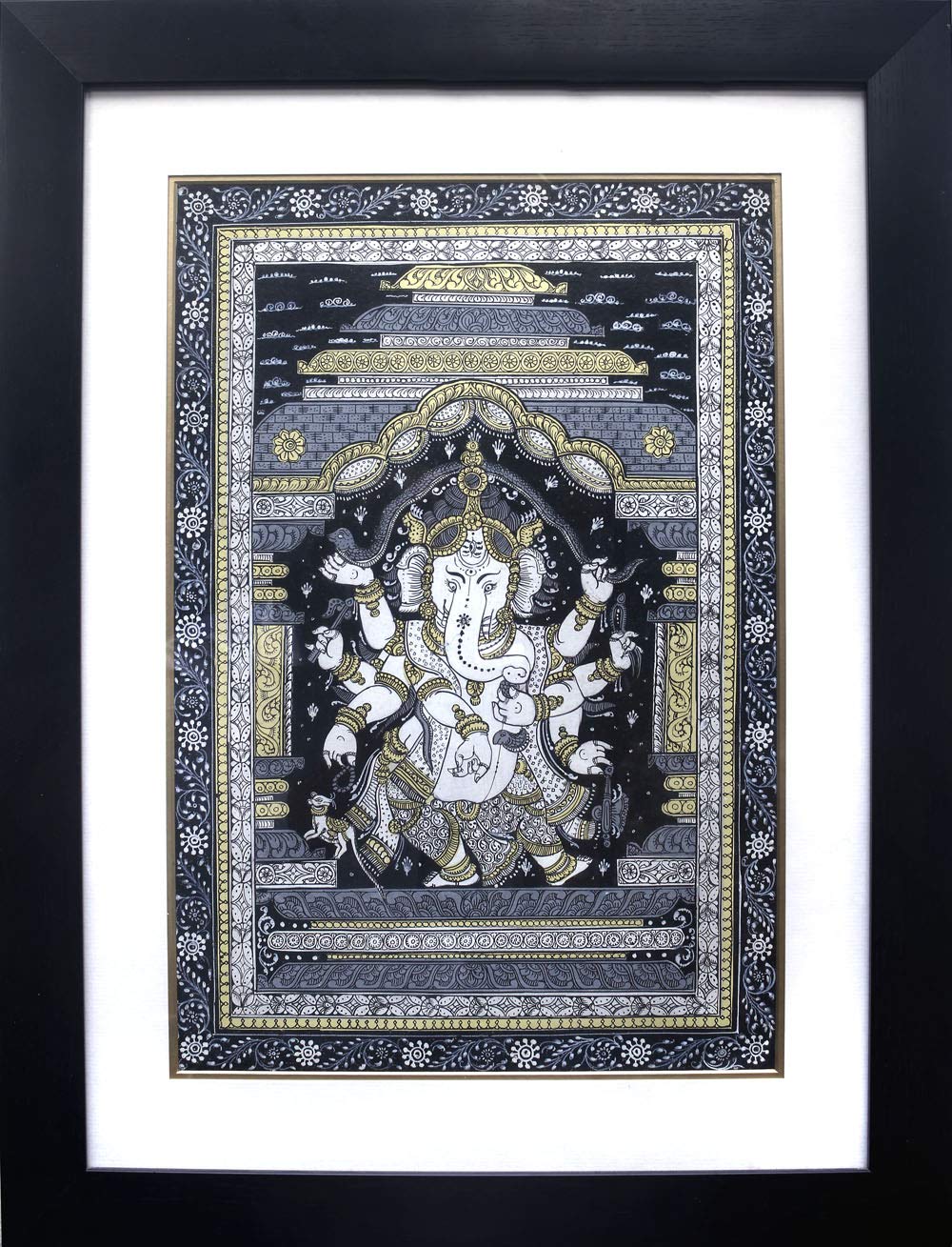 Exotic India Lord Ganesha Dancing and Stretching a Snake Over His Head (Framed) - Water Color Painting on Patti -
