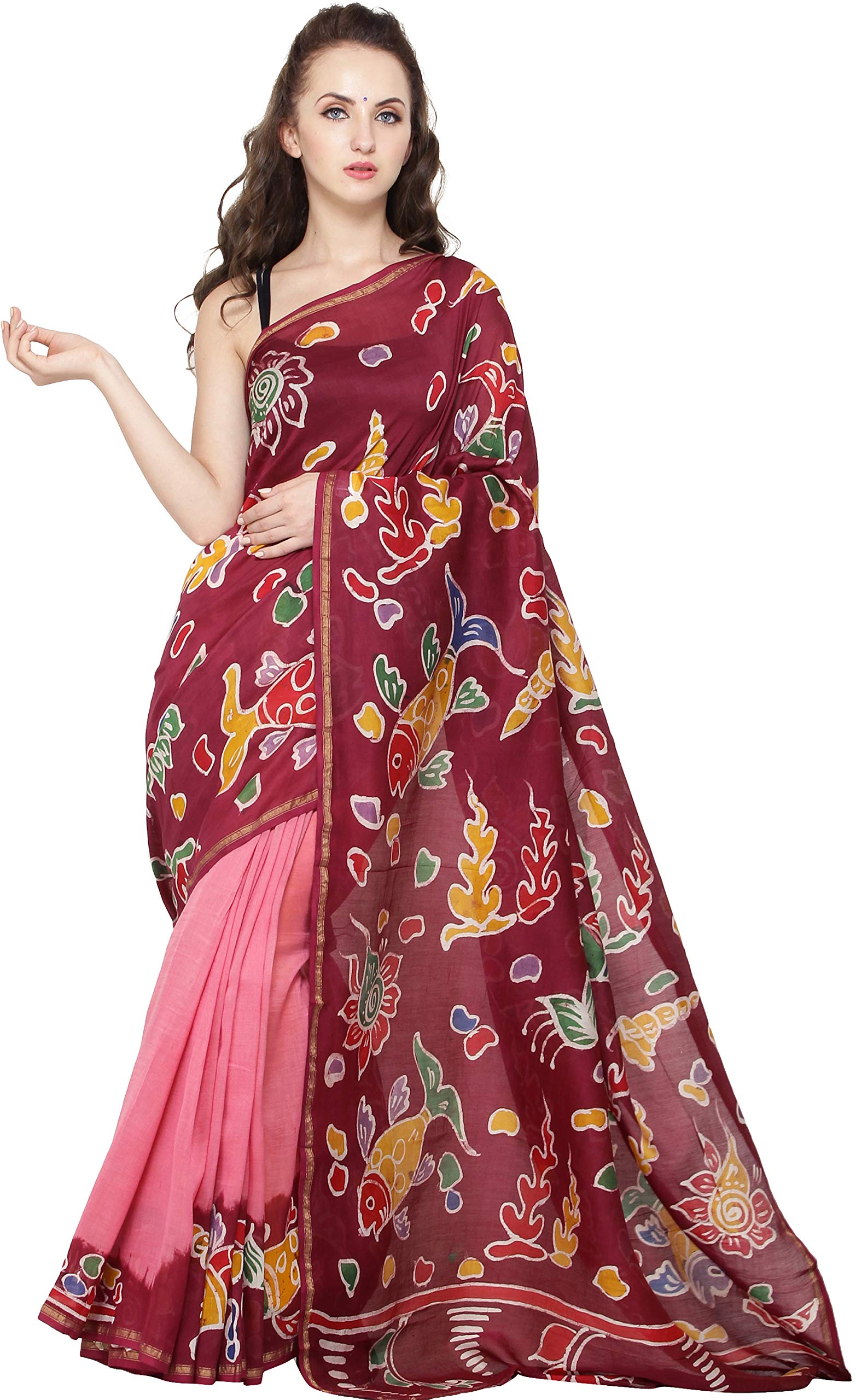 Exotic India Rumba-Red and Pink Batik Sari from Madhya Pradesh with Printed Fishes