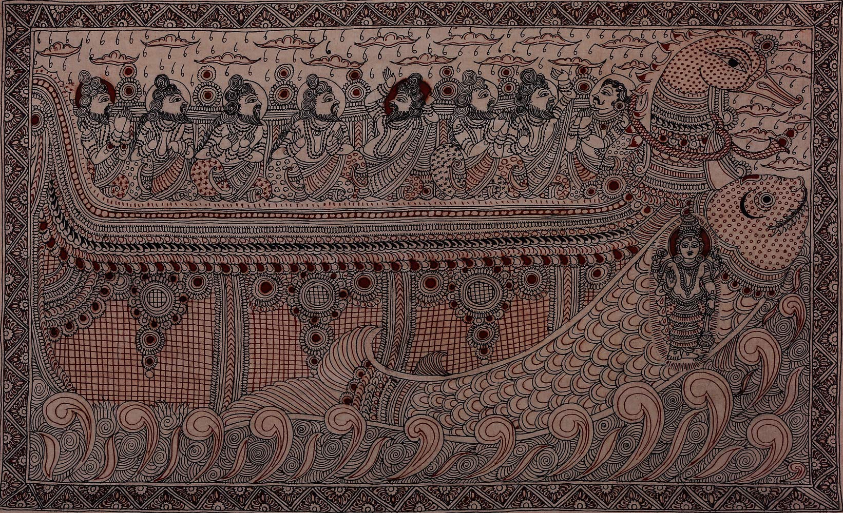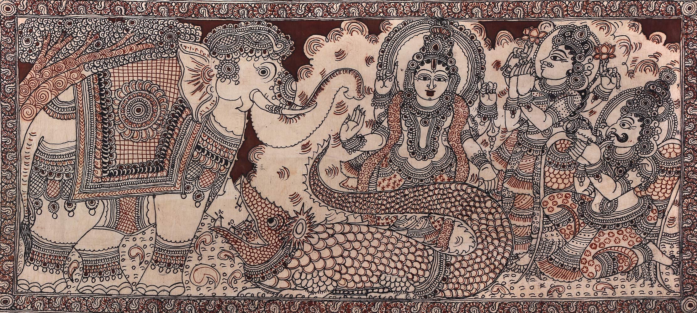Exotic India Matsya Avatar of Vishnu Saving Rishis During Pralaya - Kalamkari Painting on Cotton - Artist - D. La