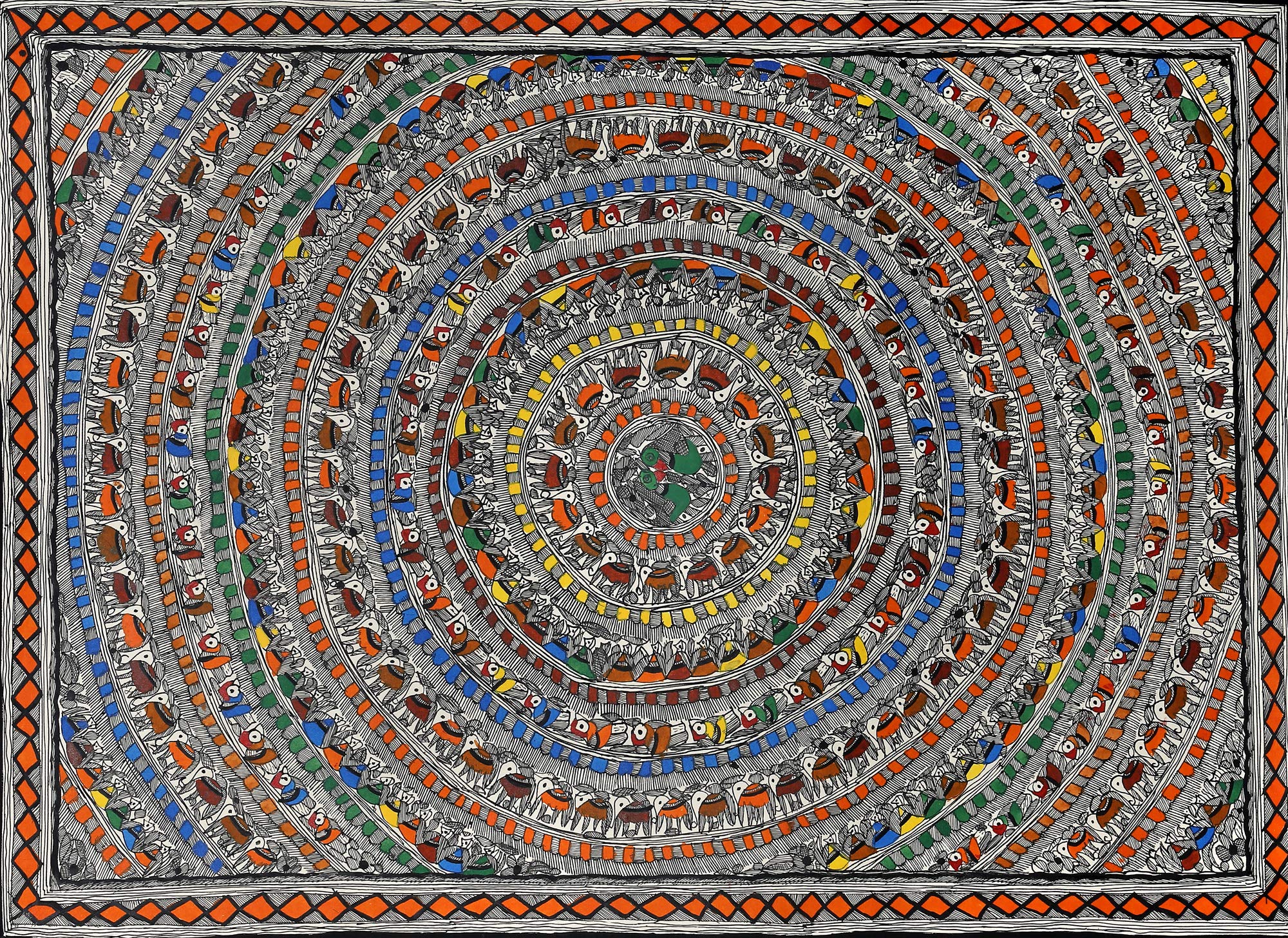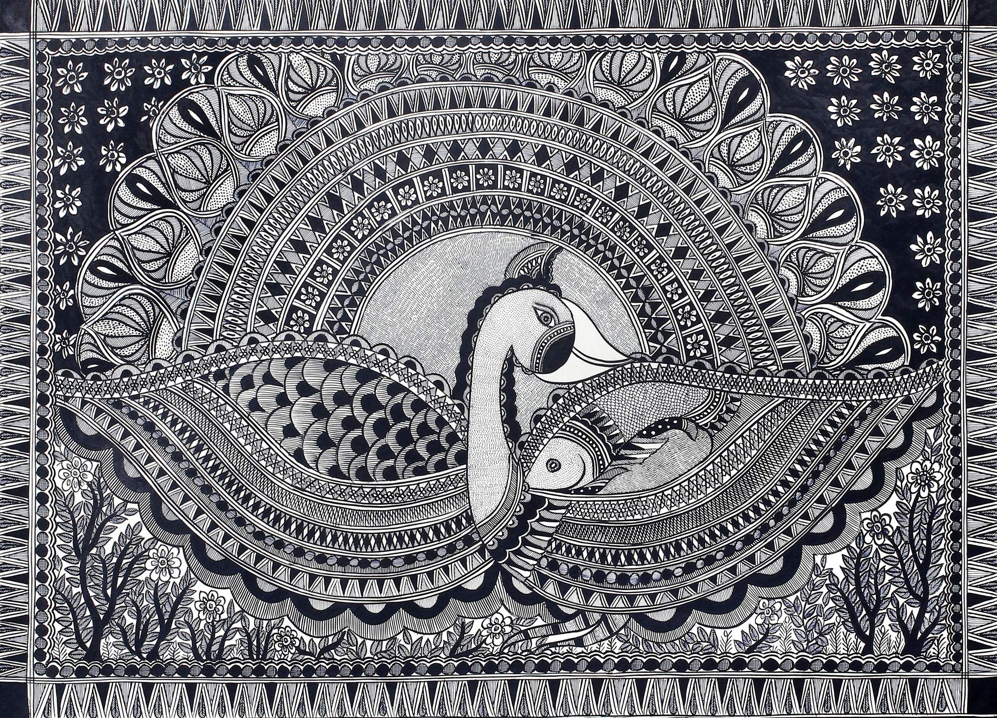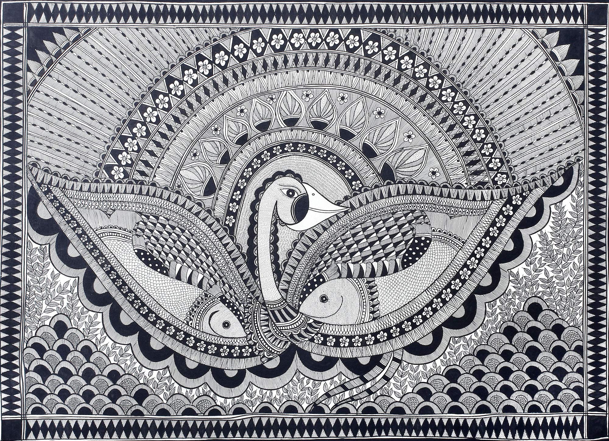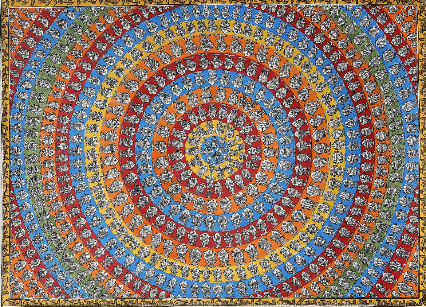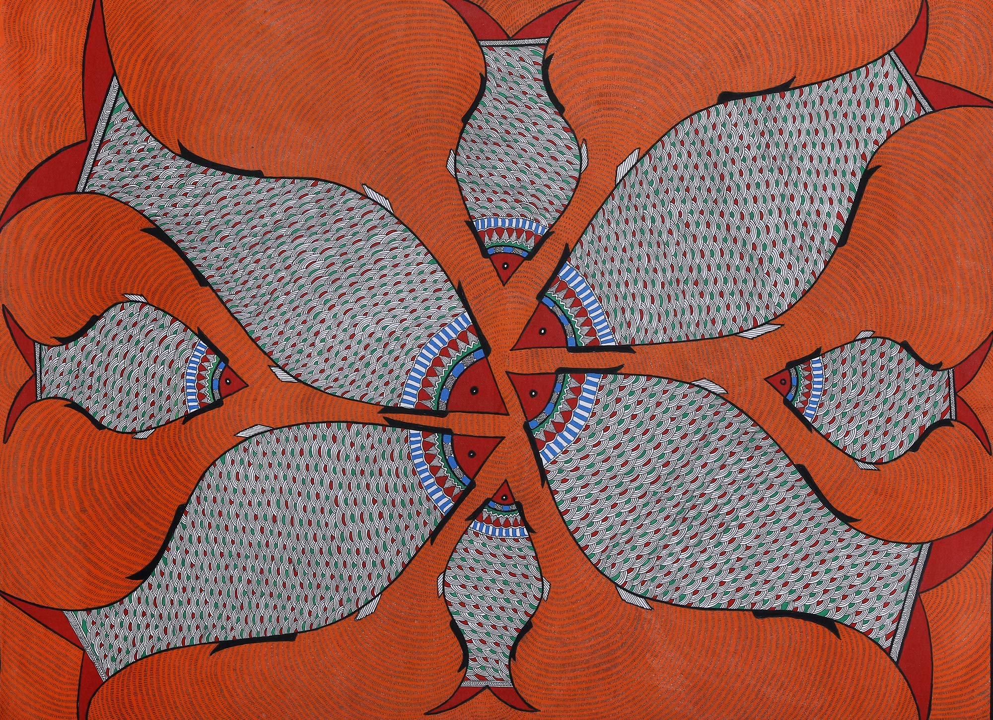 Exotic India A Dense Fish Mandala - Madhubani Painting on Hand Made Paper Treated with Cow Dung - Folk Painting f